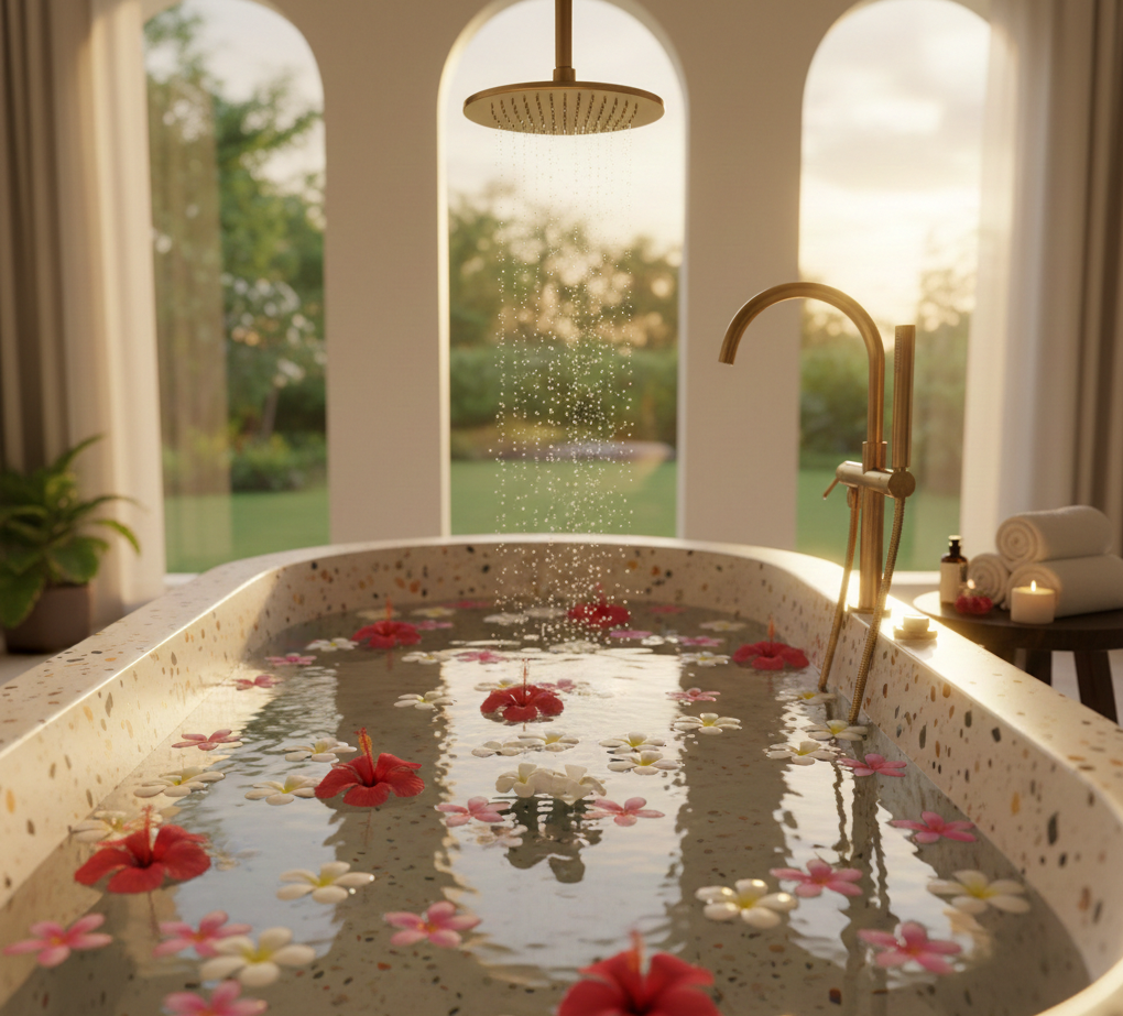 Last Wednesday started as a “Bali Blueprint” day: water aerobics in the sun and a gentle, whispering breeze. It was peaceful until I came inside to shower. I stepped into my deep, terrazzo-tile tub. It’s the romantic kind you see in the movies, with flowers floating on the surface.